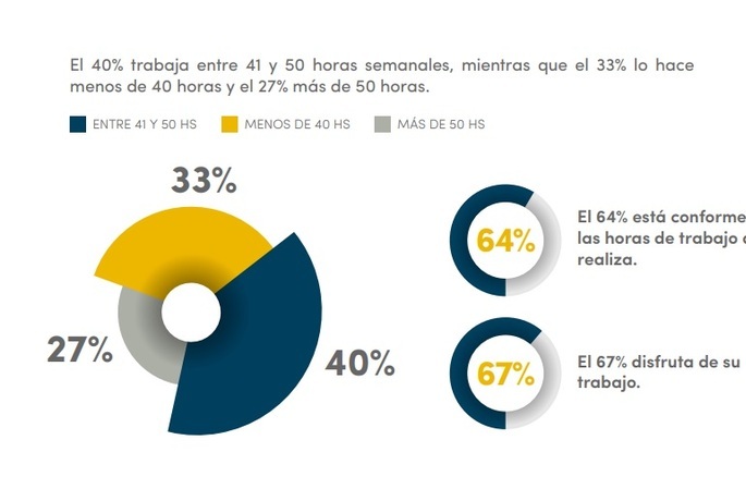 Atentos a los aspectos de calidad de vida en torno al área laboral, es decir, el nivel de conformidad del líder empresario con la cantidad de horas dedicados al trabajo y su disfrute, el 40% manifestó que trabaja entre 41 y 50 horas semanales, mientras que el 33% lo hace menos de 40 horas y el 27% más de 50 horas. Además, el 64% dijo estar conforme con las horas de trabajo que realiza; y el 67% disfruta de su trabajo.